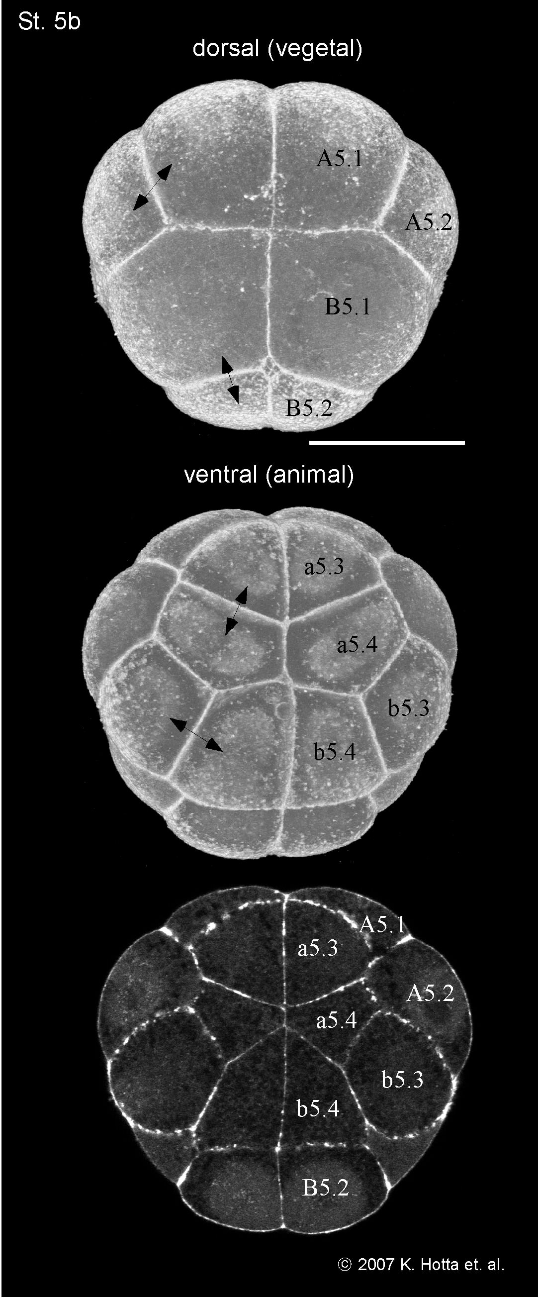 16-cell embryo (2.35 hours). All animal and vegetal cells have undergone a fourth cleavage. First sign of a clear antero-posterior polarity in the shape of embryo, resulting from the action of the CAB: the B5.2 blastomere is significantly smaller than the others. This stage is split into early, uncompacted,16-cell stage (Stage 5a) and late, compacted, 16-cell stage (Stage 5b).