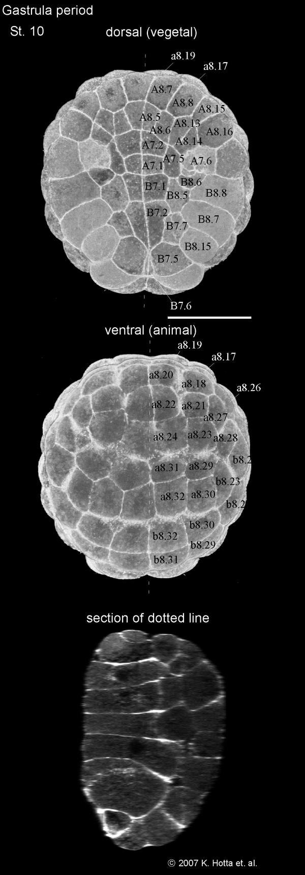 112-cell stage, initial gastrula (4.5 hours), gastrulation starts with the apical constriction of A7.1 blastomeres.