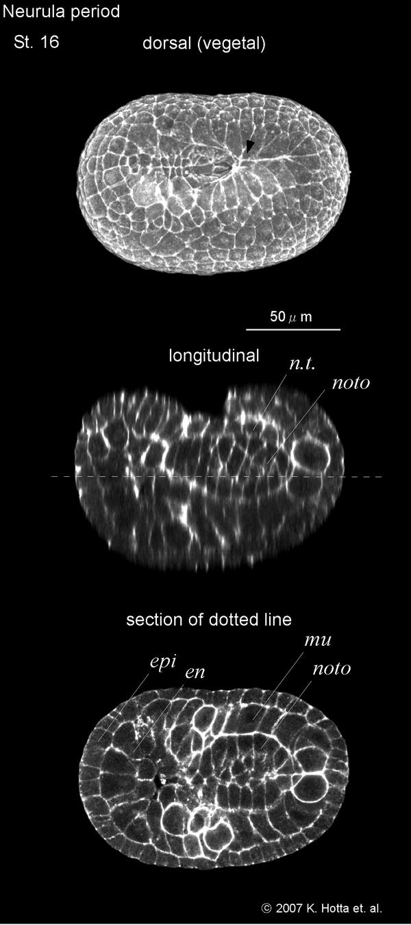 Dorsal view of three-dimensional image (upper), 50% section image (middle), and longitudinal section image (lower). Dashed lines in middle indicate the position of the section. Black arrowheads indicate the anterior edge of neural tube closure. Scale bar = 50 micro m. b.p., blastopore; n.p., neural plate; epi, epidermis; en, endoderm; mu, muscle; noto, notochord, n.t., neural tube.